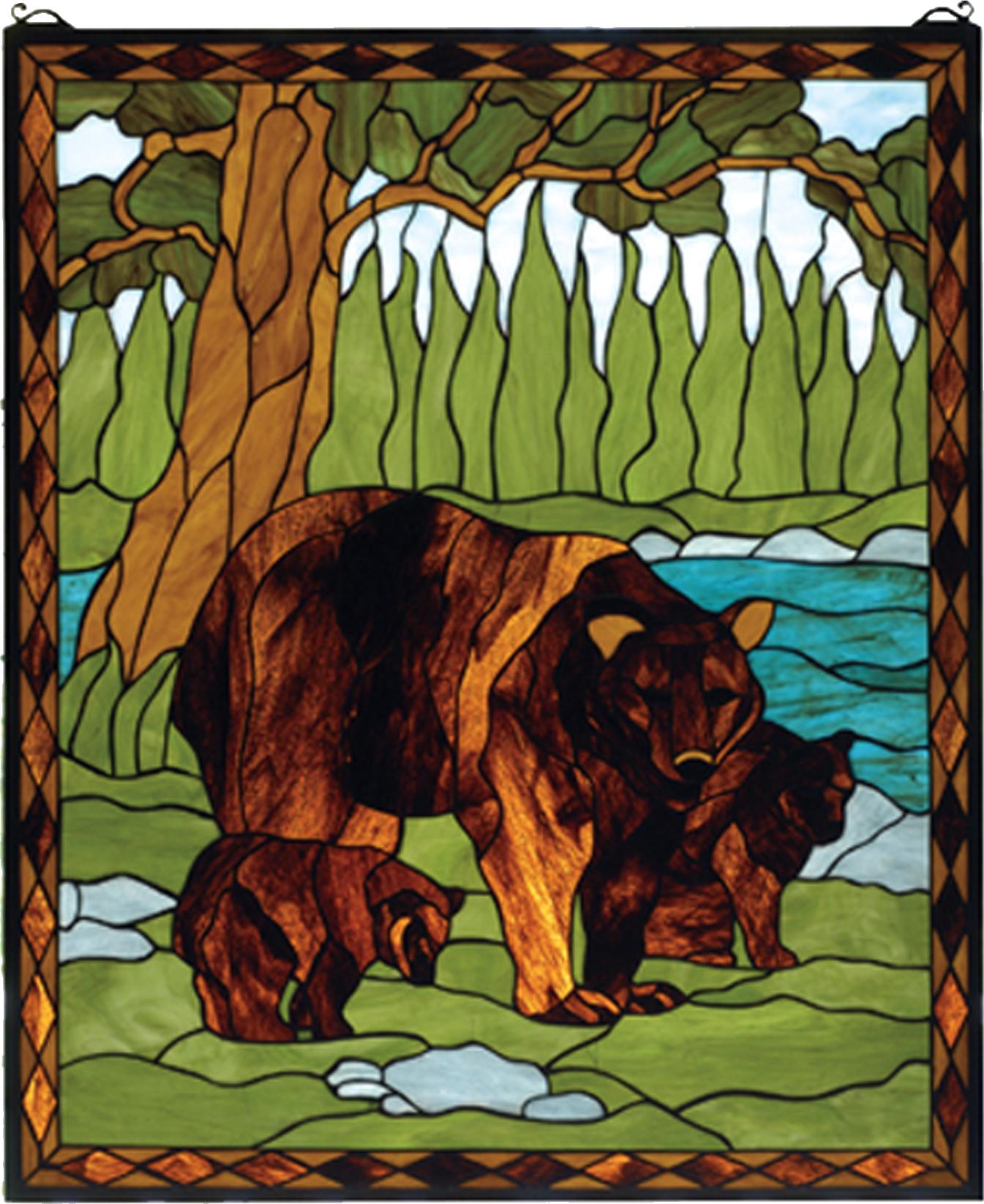 | Next To A Sparkling Turquoise River Winding Through Rolling Green Meadows With A Stand Of Pine Green Trees, A Mother Brown Bear With Her Cubs Play. This Picturesque Scene Is Handcrafted Of A Beautiful Selection Of Stained Art Glass. The Meyda Tiffany Original Window Is Framed In A Rustic Bark And Leather Brown Diamond Border. Brass Mounting Bracket And Chains Are Included Height: 30" |