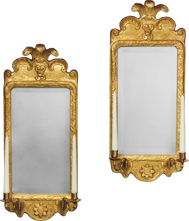 | Made in the USA High-end designer quality candle wall sconce. In 1710 to 1750 the prototypes of these sconces were found in the homes of the English Nobility. The brass arms are made to swivel as were the original antiques. This allows for more or less reflection into the room as desired. 12 x 29 |