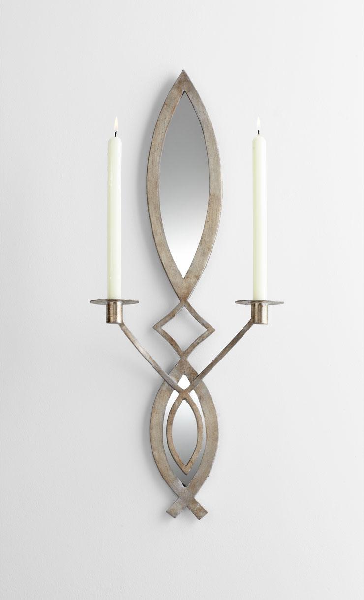 Wall sconce with mirrors supports two candles. Taper candles not included.