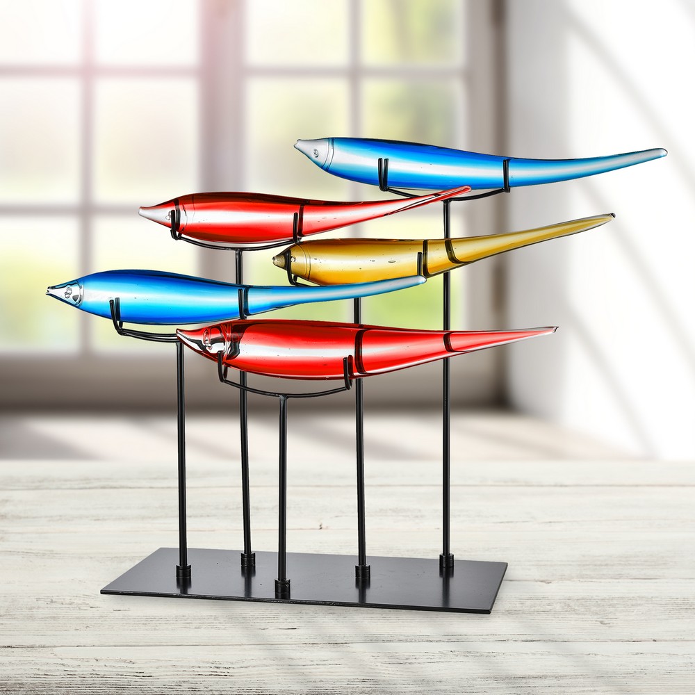 | Always at the forefront of home style trends, Dale Tiffany is pleased to present our new collection of Fish Sculptures. Each sculpture portrays a school of stylized, elongated tropical fish that are Handcrafted using our superior quality art glass. Grouped together, each fish seem to be swimming in synchronous motion with the rest, giving the overall piece an appearance of fluid motion. Standing over 1 ½ feet in height, these unique pieces command attention and will easily become the focal point in any room. This 5 Piece Multicolored Fish Sculpture features 5 bright fish in sunny shades of amber, red and blue. Each fish sits in a bracket atop a stake that is mounted on a rectangular base. The perfect gift for the aquatic enthusiast or anyone who appreciates the new and exotic, our Art Glass Fish Sculptures make the perfect pet…no care or feeding required.Dale Tiffany Sculpture / Figurine Bulb Type: Not Applicable Bulb Wattage: Not Applicable Shade Material: Not Applicable Base Material: Metal Not Applicable Not Applicable Switch |