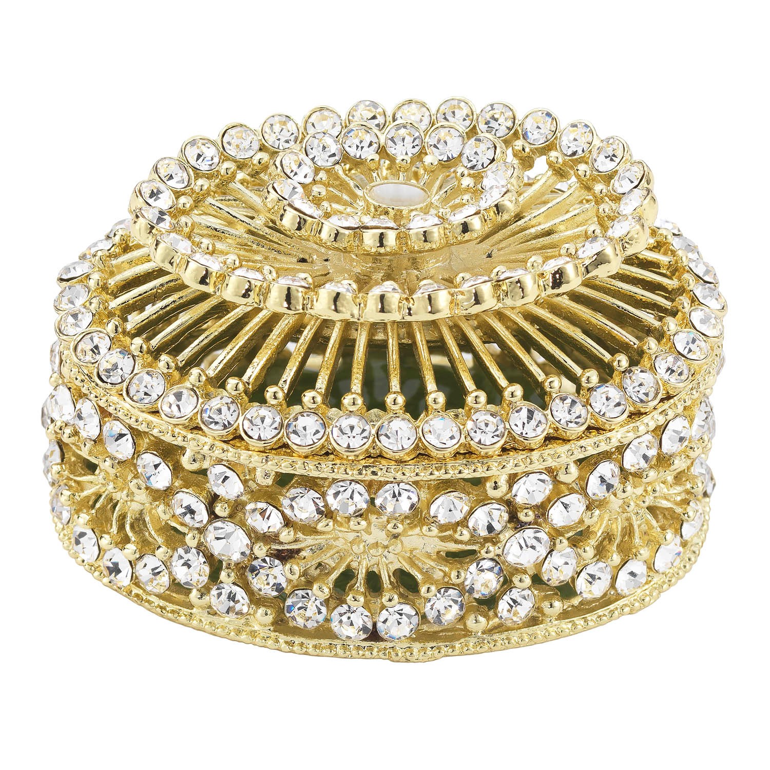 Gold finished cast pewter filigree work with hand-set clear European crystals, topped with a white cat’s eye cabochon stone. Celadon hued hand-enameled interior.