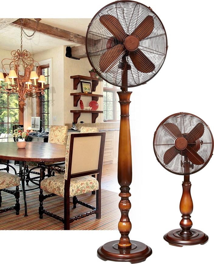 | 12" Table Top Fan 29"H x 12"W 3 Speed, Oscillating, 30 Watt Motor Fan base is made of solid resin. Fan shades are metal with a wood coating. Fan does not tilt or telescope. |