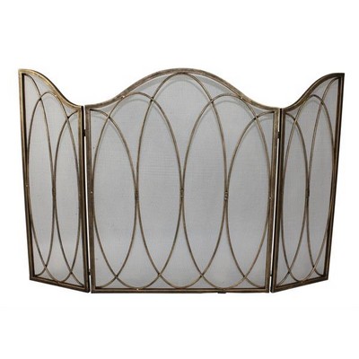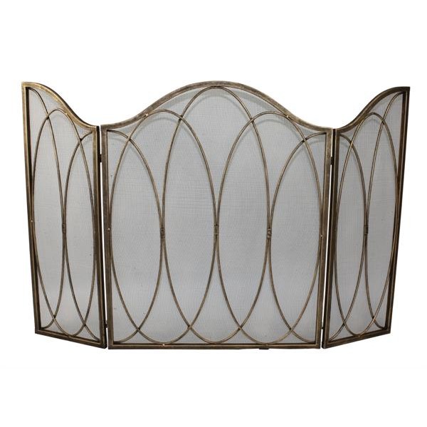 | Three panel fireplace screen with mesh backing. Light Burnished Gold oval design is hand forged and finished by master craftsmen. Swivel legs. Weighs 16 lbs |