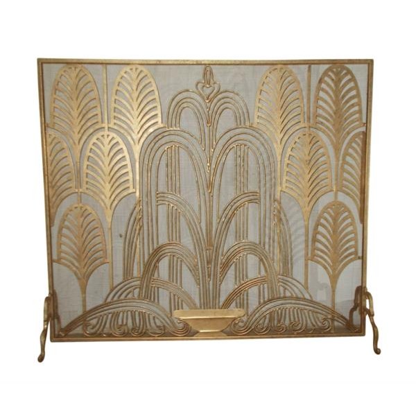 | Single panel fireplace screen with mesh backing. Gold art deco design is hand forged and finished by master craftsmen. Swivel legs. Weighs 20 lbs |