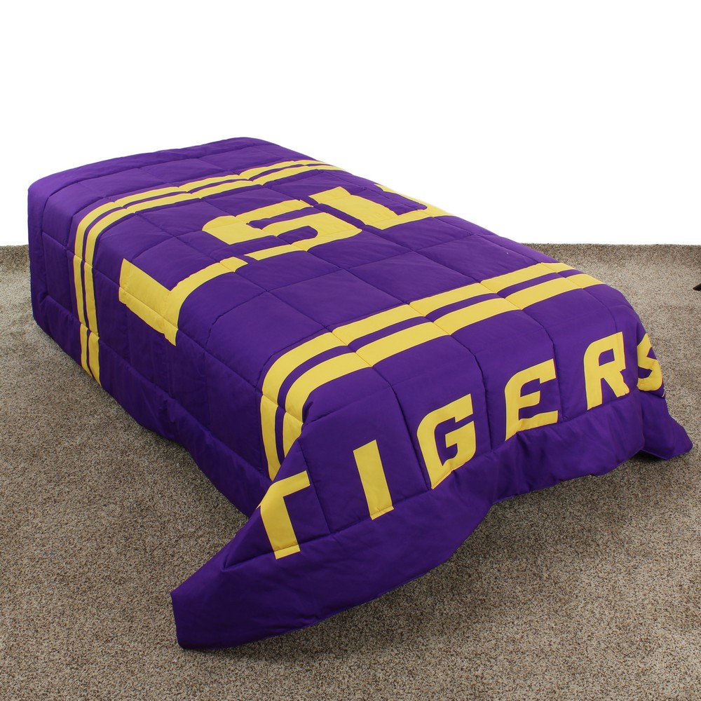 | LSU Tigers Bright and Vibrant Offically Licensed Colors and Logos Used on a Soft Polyester Fabric Big Logo On The Front Of The Comforter, All Over Print On Back For A Reversible Comforter Comforter Set Includes: 1 Queen Comforter and 2 Pillow Shams Machine Washable In Cold Water, Tumble Dry On Low Heat. Use Commercial Washer and Dryer To Eliminate Chance Of Fabric Rubbing Queen Comforter Measures: 86" x 96". Imported Machine Wash Cold; Tumble Dry Low |