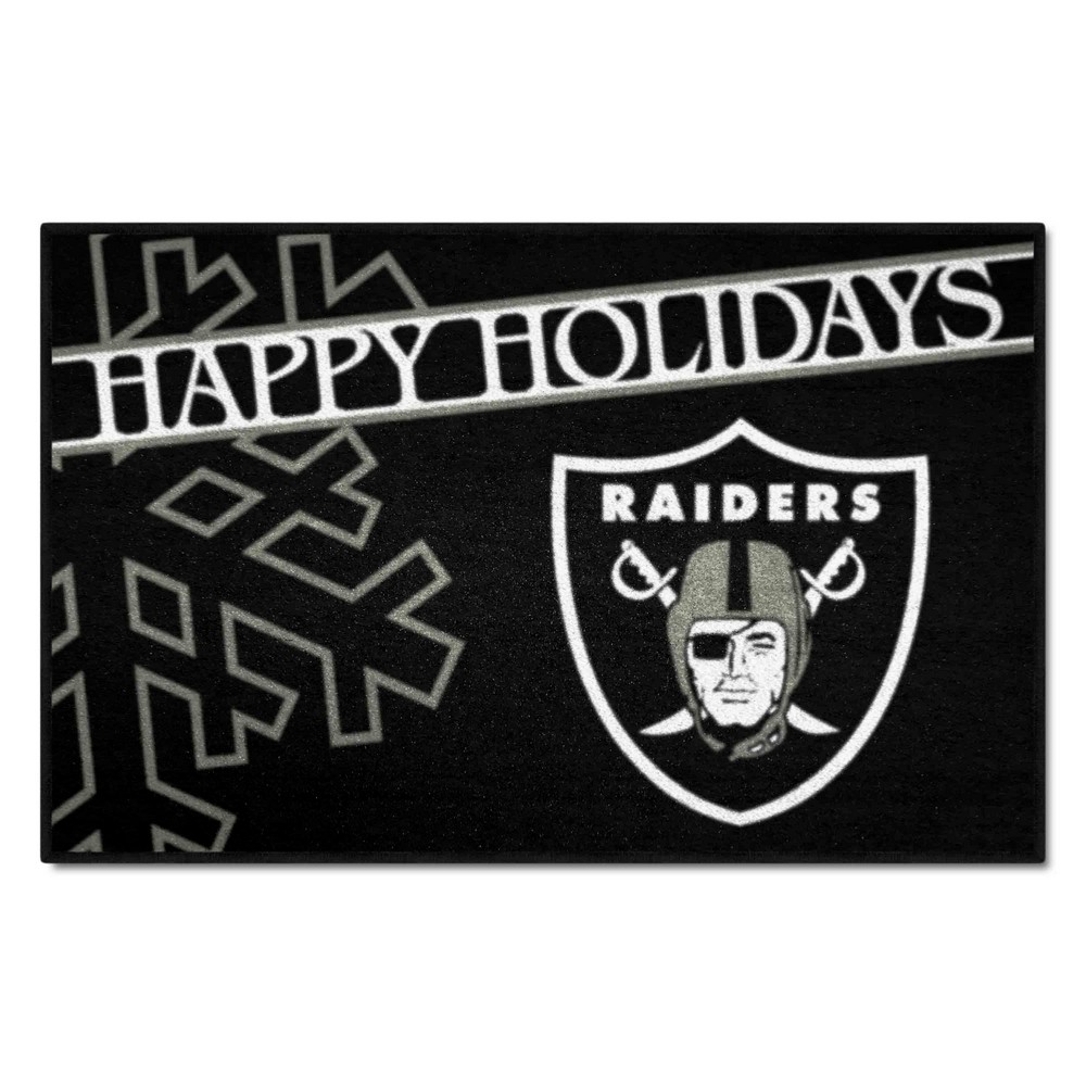 | Las Vegas Raiders Starter Mat Accent Rug - 19in. x 30in. Happy Holidays Starter Mat 9 Ounce, 100 % Nylon Face Recycled vinyl backing for a durable and longer-lasting product Machine made and tufted in the USA Non-skid backing with serged borders for added durability Machine washable; vacuum regularly and spot clean for any easy and quick clean Officially licensed and chromojet-printed in true team colors for vibrant, lasting color NFL - Las Vegas Raiders in Nevada NFL National Football League |