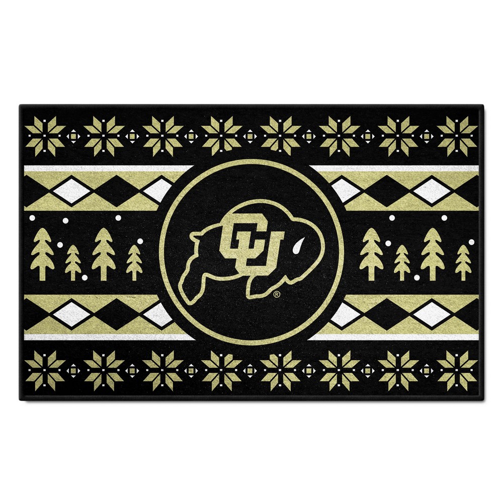 | Colorado Buffaloes Holiday Sweater Starter Mat Accent Rug - 19in. x 30in. 9 Ounce, 100 % Nylon Face Recycled vinyl backing for a durable and longer-lasting product Machine made and tufted in the USA Non-skid backing with serged borders for added durability Machine washable; vacuum regularly and spot clean for any easy and quick clean Officially licensed and chromojet-printed in true team colors for vibrant, lasting color University of Colorado in Colorado |