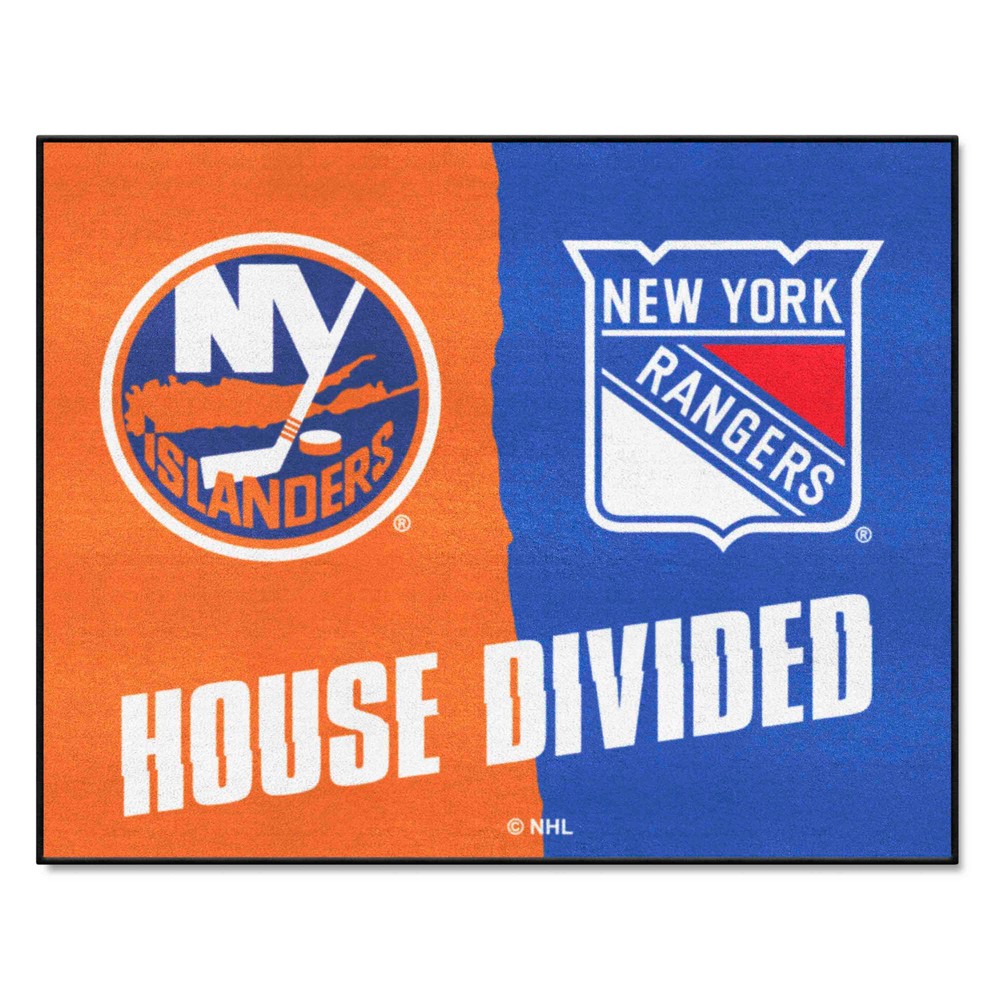 | NHL House Divided - New York Islanders / New York Rangers House Divided Rug - 34 in. x 42.5 in. 9 Ounce, 100 % Nylon Face Recycled vinyl backing for a durable and longer-lasting product Machine made and tufted in the USA Non-skid backing with serged borders for added durability Machine washable; vacuum regularly and spot clean for any easy and quick clean Officially licensed and chromojet-printed in true team colors for vibrant, lasting color NHL House Divided - Islanders / Rangers in New York NHL National Hockey League |