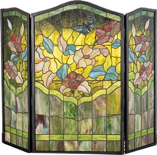 | Butterfly Fireplace Screen 34"H x 40"W Free Shipping on Tiffany Style Lamps A Butterfly soars above Beige and Merlot blooms against Summer Green granite glass. This beautiful fireplace screen is created from 248 pieces of stained art glass and framed in solid brass channel. |