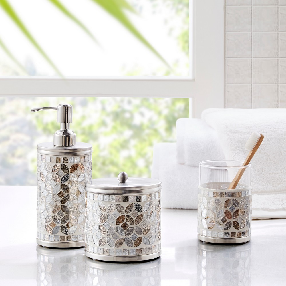 | Croscill One Size 1 Tumbler: 3"W x 3"D x 4.33"H glass mosaic and stainless steel 304 Glam/Luxury Style Includes 1 Piece(s) Wipe with a soft, damp cloth to remove excess moisture; avoid the use of harsh chemicals or abrasive cleaning materials This timeless mosaic collection showcases hand-crafteded mosaic accessories to elevate your bathroom. The combination of champagne gold and silver stained glass in a floral motif reflects light beautifully and can be a luxurious centerpiece for bathroom decor. |