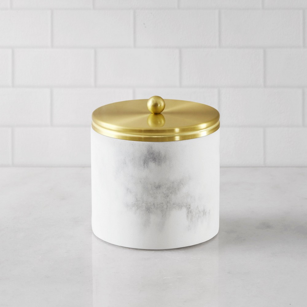 | Croscill One Size 1 Jar: 4"W x 4"D x 4.6"H Marble Resin Sand Glam/Luxury Style Includes 1 Piece(s) Wipe with a soft, damp cloth; avoid the use of harsh chemicals or abrasive cleaning materials This elegant accessory collection features a modern design. Pairing hardware made of brushed gold color with traditional Croscill marble design. It is a classic addition to any bathroom. |