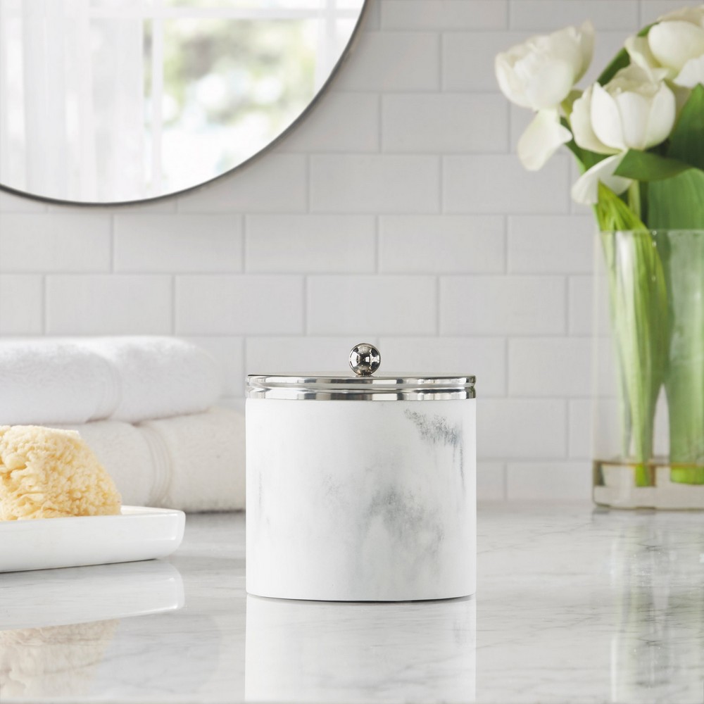 | Croscill One Size 1 Jar: 4"W x 4"D x 4.6"H Marble Resin Sand Glam/Luxury Style Includes 1 Piece(s) Wipe with a soft, damp cloth; avoid the use of harsh chemicals or abrasive cleaning materials This elegant accessory collection features a modern design. Pairing hardware made of stainless steel with traditional Croscill marble design. It is a classic addition to any bathroom. |