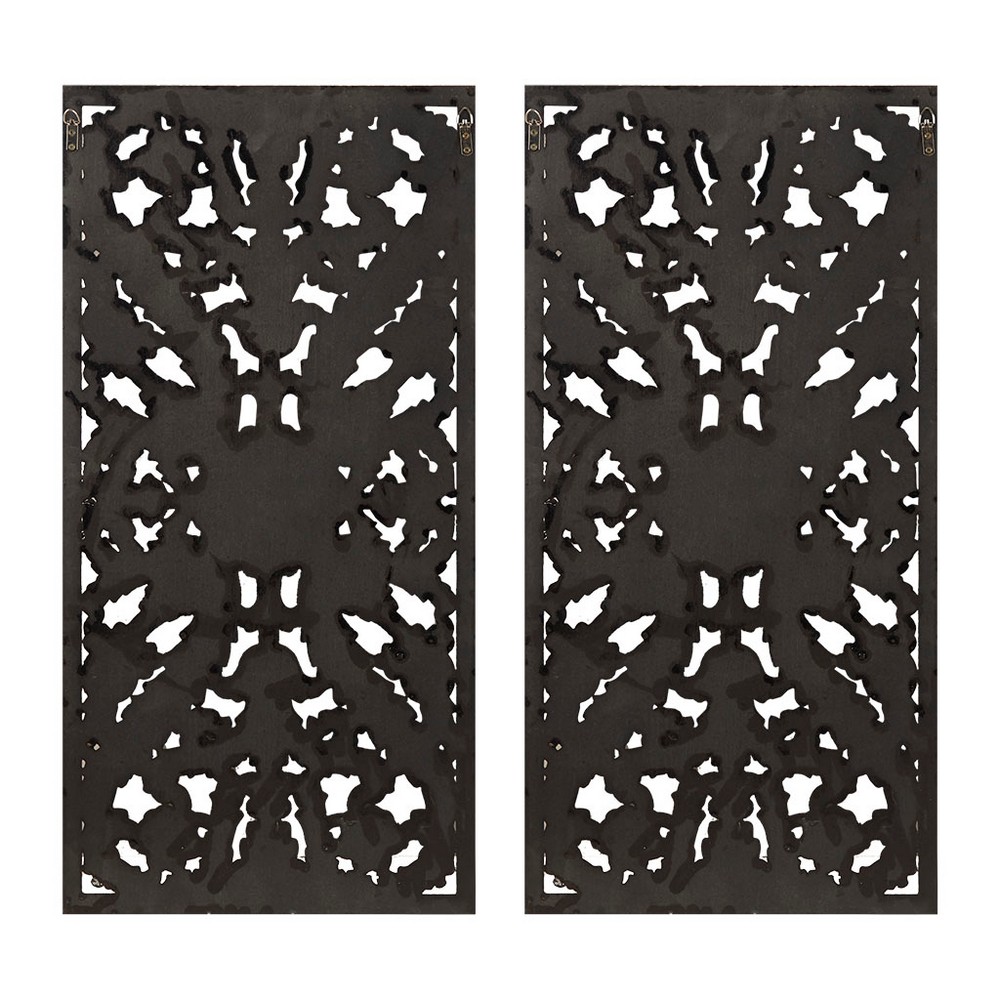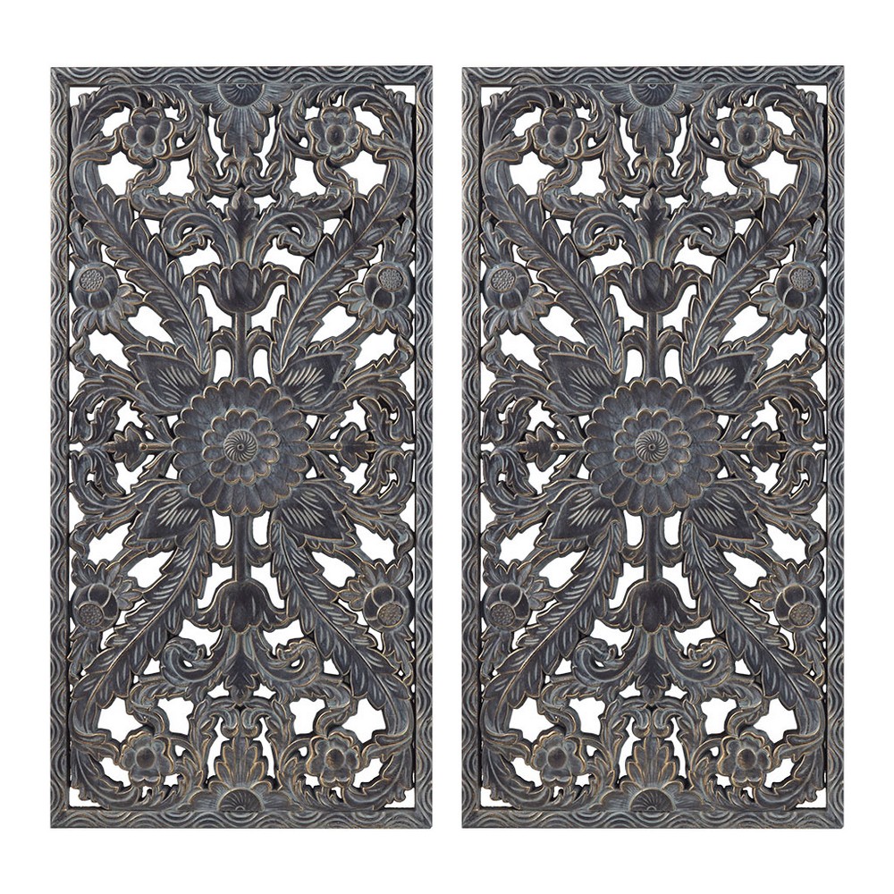 | Madison Park See below 2 Wall Panels: 15.75"W x 31.5"H x 0.59"D (2) MDF: 100% Transitional Style Includes 2 Piece(s) Spot clean only Complete your home decor with our Madison Park Botanical Panel Distressed Carved Wood 2-piece Wall Decor Set. This wall decor set features exquisite carved global botanical designs in a durable MDF material creating beautiful texture and dimension, while an antique silver and blue coat finish adds a unique color and luster. Each piece is finished with two D-rings on the reverse making it easy to hang pieces, either side by side for a more clean look or staggered for a more stylized approach. Perfect for any Living Room, Dining Room, or Entry way - this carved wood panel 2 piece set is the perfect elegant touch to any decor. |