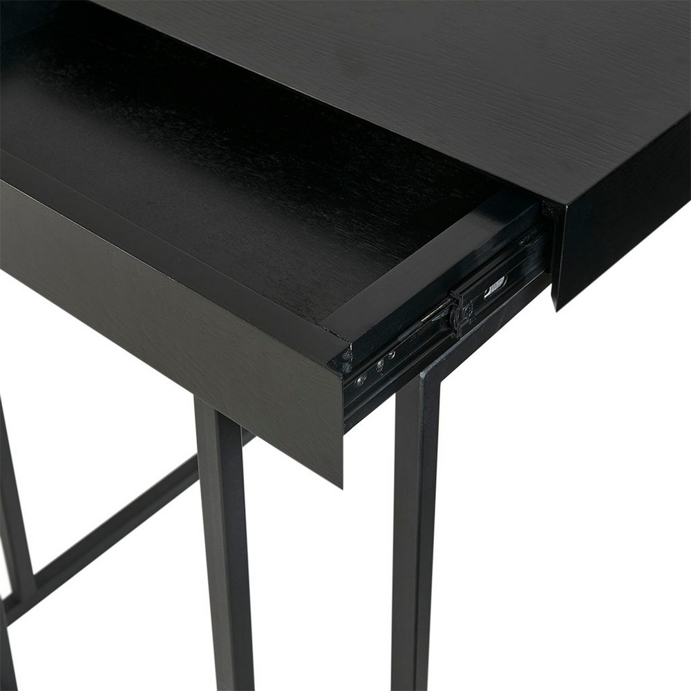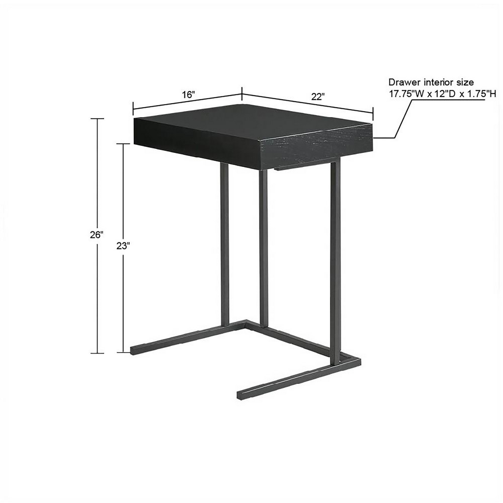 | Ink+ivy See below 1 Pull Up Table: 22"W x 16"D x 26"H Table Top Size: 22"W x 16"D x 0.5"H Leg Height: 23"H Clearance Under Table Top: 23"H Drawer Interior Size: 17.75"W x 12"D x 1.75"H Maximum Weight Capacity (Surfaces): 85lbs Material: MDF with solid wood veneer, solid wood drawer, metal base Top Material: Wood Veneer and MDF Base Material: Metal Wood Construction Type: Manfactured wood with solid wood veneer Top Finish: Black Base Finish: Black Industrial Style Includes 1 Piece(s) Wipe Clean with Damp Cloth The Wynn pull up table focuses on utility and functionality, while providing simple style to any living room. The table is easy to move around with an inner storage compartment, perfect for your laptop or magazines. Pull it up to your favorite seat, as this multifunctional piece can work as a simple snack table or work desk.Assembly required. |