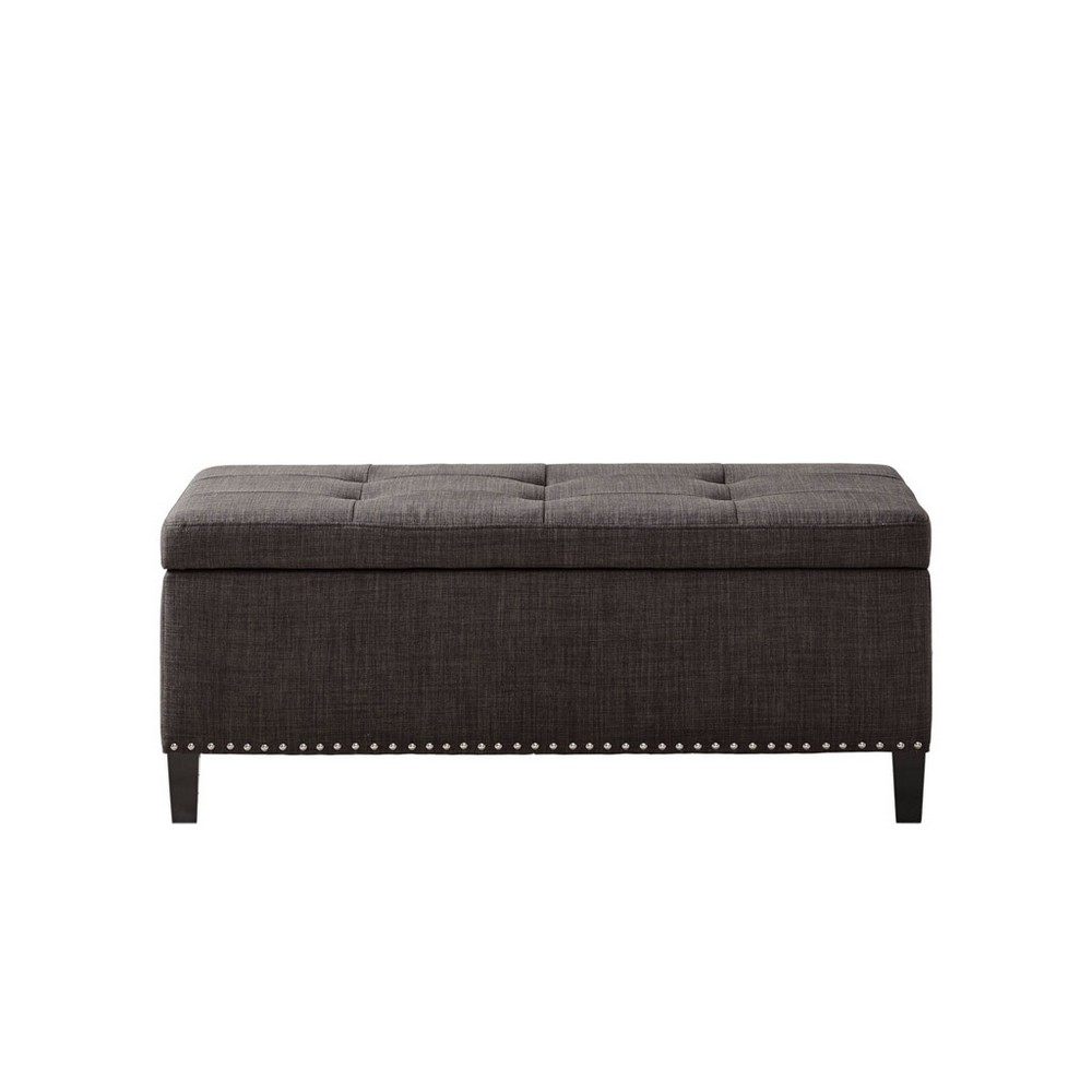 This modern storage ottoman accentuated with tufting provides ample storage and features an elegant grey linen fabric with black noir legs. Assembly required.