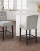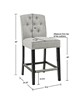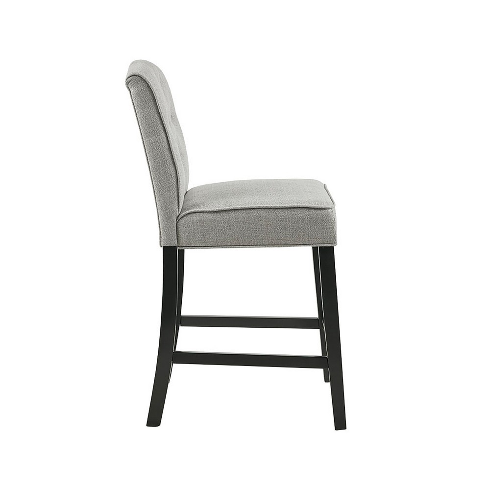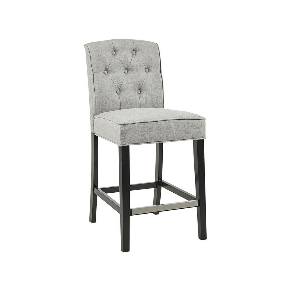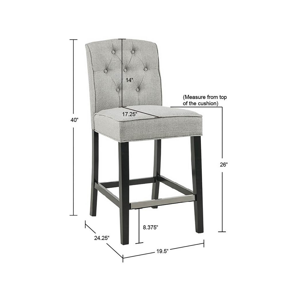 | Madison Park See below 1 Counter Stool: 19.5"W x 24.25"D x 40"H Seat Dimension: 19.5"W x 17.25"D x 26"H Footrest to Floor Height: 8.375" Footrest to Seat Height: 12.25" Seat Cushion Thickness: 2.5" Legs Height: 23.42" Back Rest Size: 19.5"W x 14"H Maximum Weight Capa Frame Composition: Solid wood Leg Material: solid wood Fabric Composition: 100% Polypropylene Cushion or Upholstery Fill Material: Foam Seat Construction: Sinuous Springs Wood Finish: Black Noir Metal Finish: Silver Kickplate Transitional Style Includes 1 Piece(s) Spot clean Add a touch of class to your dining decor with the sophisticated Madison Park Marian 26” Tufted Counter Stool. This counter stool uses high-density foam for max comfort that is upholstered in a light grey fabric, for a chic transitional look. The button-tufted accents on the back add an elegant touch to the design. A deep black wood finish on the solid wood legs provides a bold contrast to the upholstery, creating an eye-catching and refined charm that’s perfect for your kitchen. Assembly required and tools are included. |