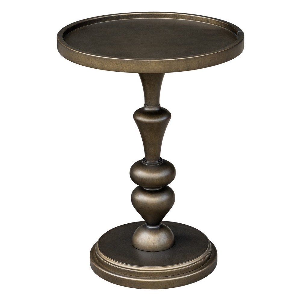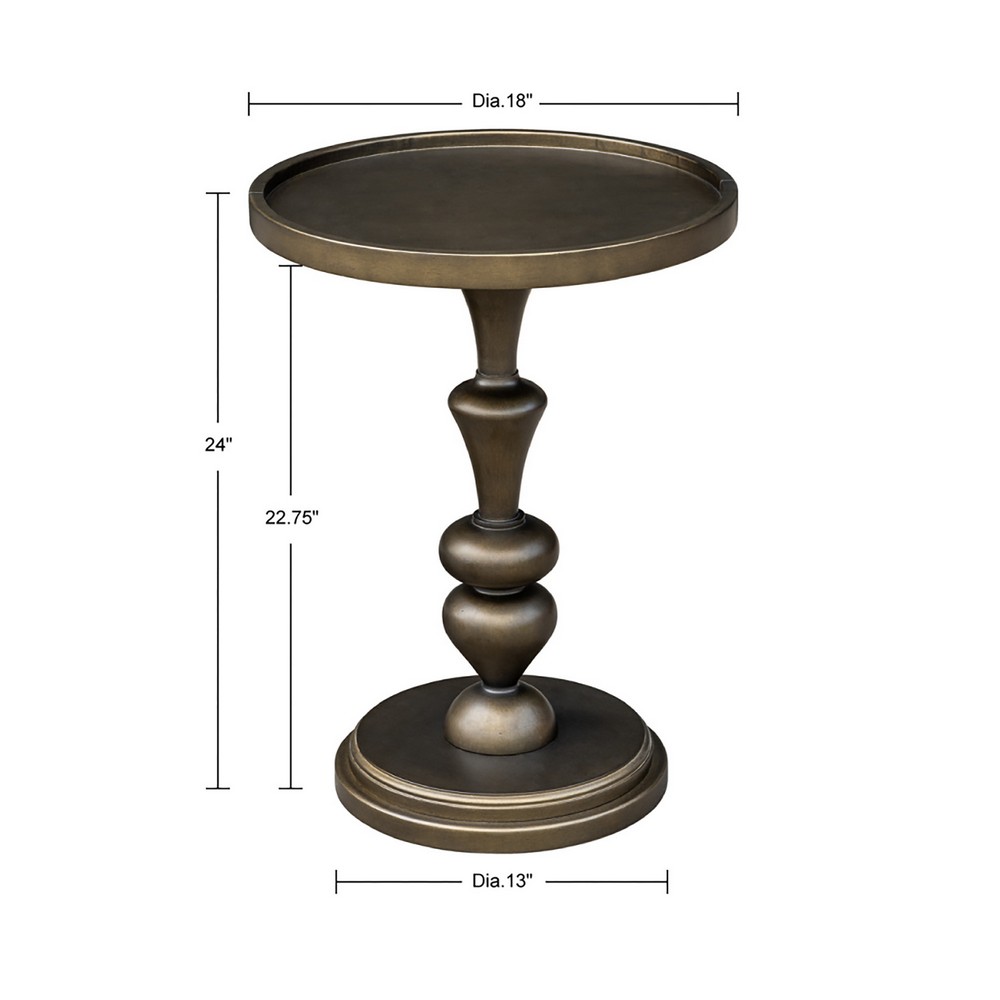 | Madison Park See below 1 Accent Table: 18"Dia x 24"H Table Top: 18"Dia x 24"H Base Size: 13"Dia Leg Height: 20" Clearance Under Table Top: 22.75" Maximum Weight Capacity: 75LBS Top Material: Plywood and wood veneer and MDF Base Material: Solid wood and MDF and plywood Top Finish: Bronze Base Finish: Bronze Transitional Style Includes 1 Piece(s) Wipe clean with damp cloth The Madison Park Del Mar pedestal accent table brings a refined addition to your home decor. This round table features an elegant turned pedestal base and a tray table top with a raised edge that helps prevent items from falling off. The bronze finish creates a stunning transitional glam look that elevates your space. Perfectly sized for small spaces, this accent table is incredibly versatile that can be used as an end table, nightstand, or plant stand. Assembly is required. |