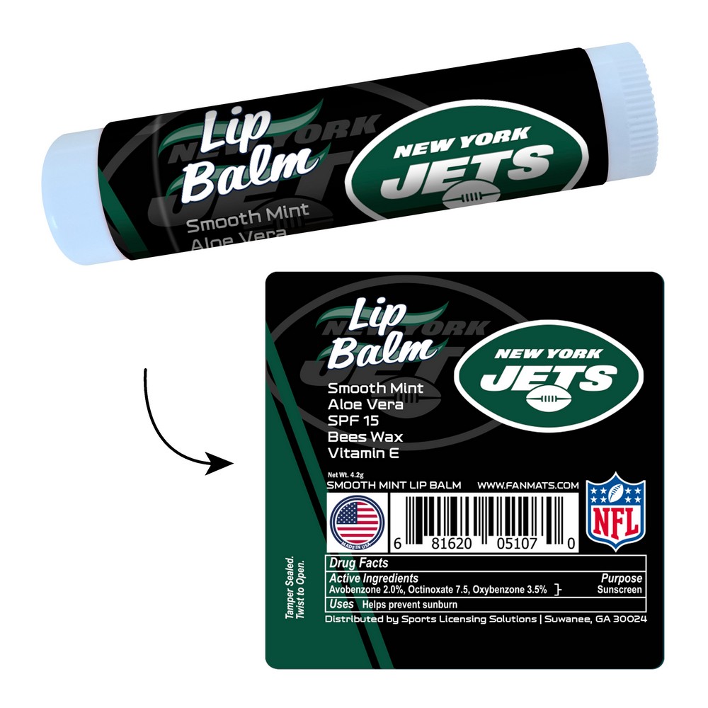 | New York Jets Smooth Mint SPF 15 Lip Balm Made with Aloe Vera, Bees Wax and Vitamin E to moisturize lips Contains SPF 15 for protection against UVA & UVB rays Water and Sweat Resistant 80 Minutes Great for use in the hot summer heat or cool winter days Smooth Mint flavor Made in the USA NFL - New York Jets in New Jersey NFL National Football League |