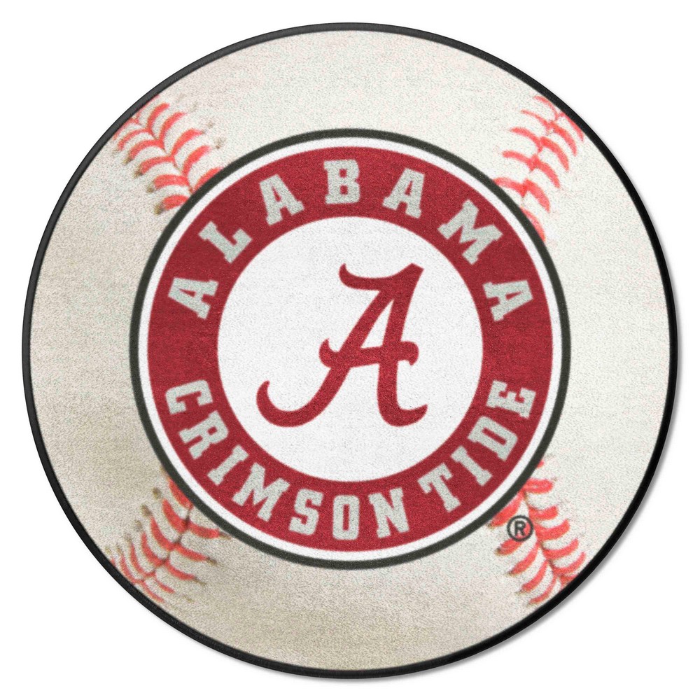 | Alabama Crimson Tide Baseball Rug, Round Logo - 27in. Diameter 9 Ounce, 100 % Nylon Face Recycled vinyl backing for a durable and longer-lasting product Machine made and tufted in the USA Non-skid backing with taped borders for added durability Machine washable; vacuum regularly and spot clean for any easy and quick clean Officially licensed and chromojet-printed in true team colors for vibrant, lasting color University of Alabama in Alabama |