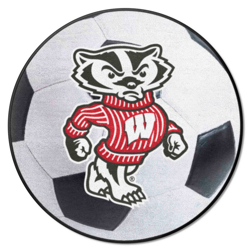 | Wisconsin Badgers Soccer Ball Rug - 27in. Diameter 9 Ounce, 100 % Nylon Face Recycled vinyl backing for a durable and longer-lasting product Machine made and tufted in the USA Non-skid backing with taped borders for added durability Machine washable; vacuum regularly and spot clean for any easy and quick clean Officially licensed and chromojet-printed in true team colors for vibrant, lasting color University of Wisconsin in Wisconsin |