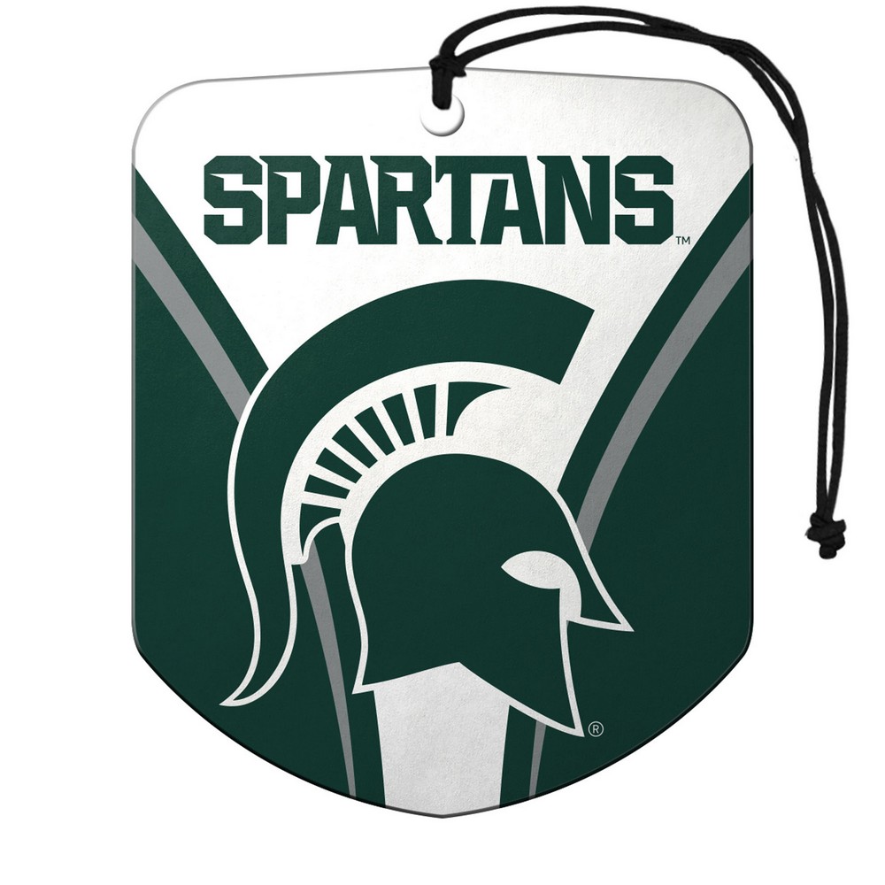 | Michigan State Spartans 2 Pack Air Freshener Long lasting fresh scent Double sided full color team design includes a bungee string for hanging in your car easily. Includes 2 individually wrapped air fresheners Perfect addition to any vehicle Approximately 2.75in x 3.5in Michigan State University in Michigan |