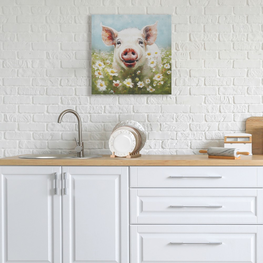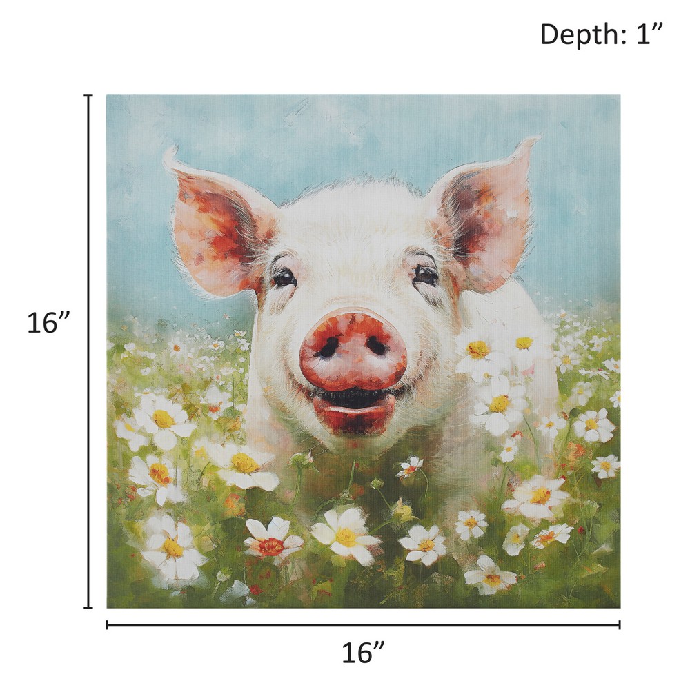 | Madison Park See below Overall: 16"W x 16"H x 1"D MDF: 90% Canvas: 10% Casual Style Includes 1 Piece(s) Spot clean only Bring a touch of whimsy to your interiors with Tessa Kane's 16"W x 16"H happy pig wall art decor. This joyous canvas features a radiant pig blissfully dancing in flower fields, instantly sparking joy. Create a farmhouse decor with multiple pieces of farm animal canvas by Madison Park. Ready to hang with a sawtooth which ensures a quick and easy installation. For indoor use only. Infuse charm and happiness into your home with this captivating art decor for your dining room, kitchen, or living room. |