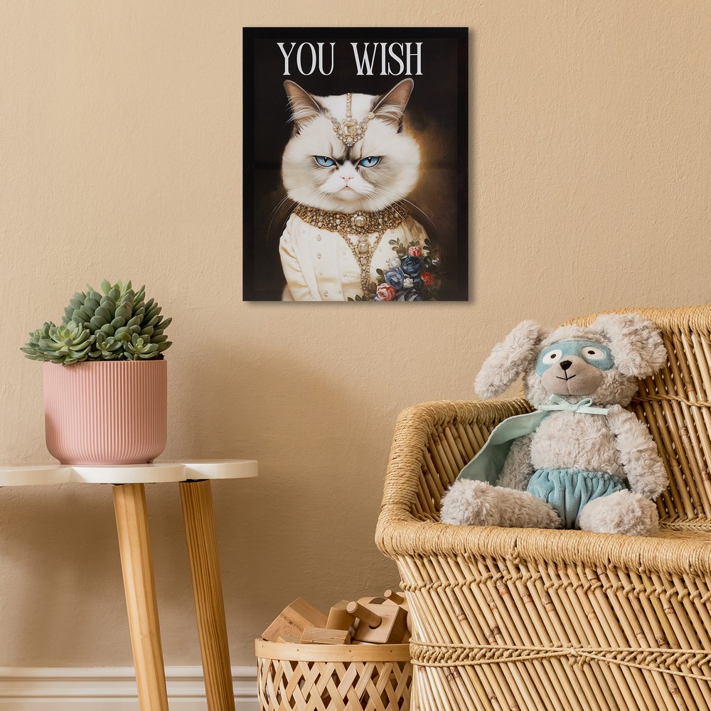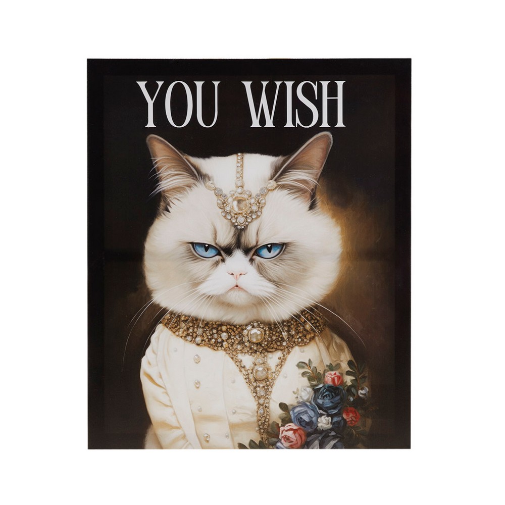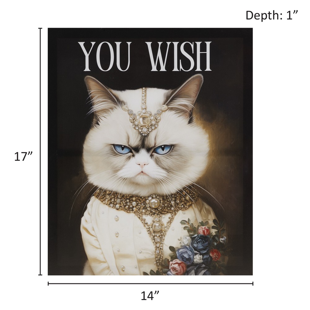 | Madison Park See below Overall: 14"W x 17"H x 1"D MDF: 45% Canvas: 55% Modern/Contemporary Style Includes 1 Piece(s) Spot clean only Add a dose of humor and charm to your living space with Tessa Kane's grumpy cat art. This canvas, featuring the witty 'You Wish' quip, goes beyond typical wall decor—it's a daily source of amusement. Effortlessly hang it with the pre-installed sawtooth hanger, and keep it looking its best with spot cleaning. Created for indoor use, it infuses your home decor with a unique and lighthearted touch. Embrace the feline attitude and let this artwork bring daily laughter and character to your surroundings. Ideal for cat lovers and those who enjoy a touch of wit in their decor, it's a delightful addition to any space, adding cheer and a hint of irreverence throughout your home |