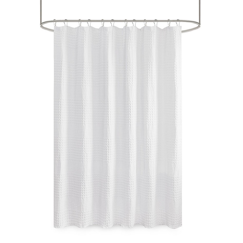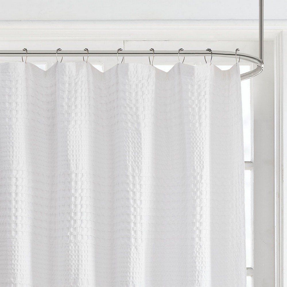 | Madison Park 72x72" 1 Shower Curtain: 72"W x 72"L 100% Cotton Modern/Contemporary Style Includes 1 Piece(s) Machine Washable Give your bathroom a spa-like allure with the Madison Park Arlo Super Waffle Textured Solid Shower Curtain. This solid White shower curtain features a heavy waffle weave base fabric that creates a rich texture for a simple and stylish update. The medium weight fabric allows a natural and rich drapability, while the 100% cotton provides the perfect natural touch. Each shower curtain is machine washable for easy care and finished with 12 button holes at the top, making it easy to attach hooks and hang on rod (hooks and rod not included). A water repellant liner is not included, but highly recommended to ensure the best care and handling of this rich medium weight shower curtain. Coordinates perfectly with the Madison Park 800 GSM Bath Towel Collection. |