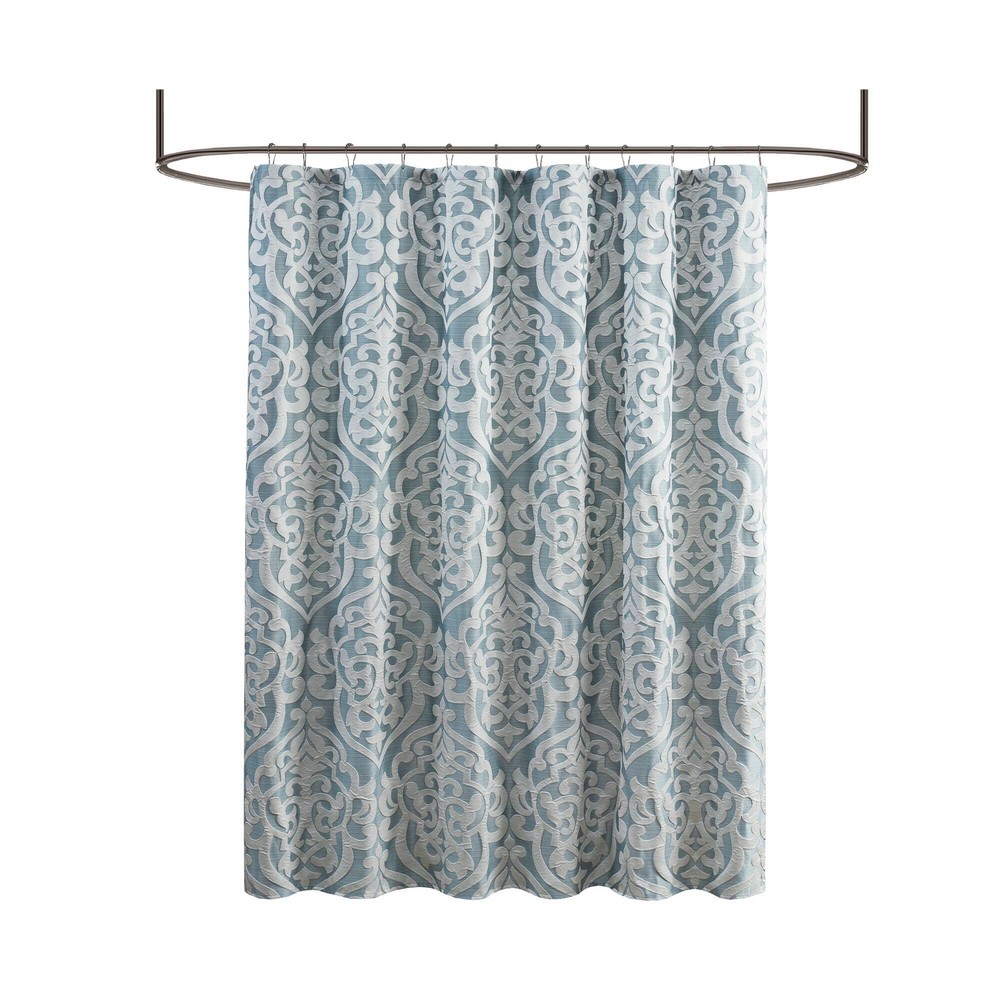 | Madison Park 72x72" 1 Shower Curtain: 72"W x 72"L 100% Polyester Jacquard Traditional Style Includes 1 Piece(s) Machine Washable Add a touch of class to your bathroom with our Madison Park Odette Jacquard Shower Curtain. This luxurious textured shower curtain flaunts a gorgeous silver damask medallion design on a stria aqua jacquard ground that adds rich texture and dimension to the lavish look. Measuring 72x72", each shower curtain is finished with 12 button holes on top making it easy to assemble hooks and hang onto rod (hooks and rod not included). To better preserve this beautiful shower curtain, a water repellant liner is highly recommended and can be purchased separately (liner not included). Machine washable for easy care; complete the collection with coordinate matching bedding, alas available and sold separately. |
