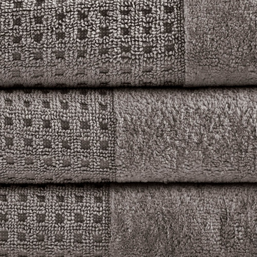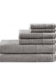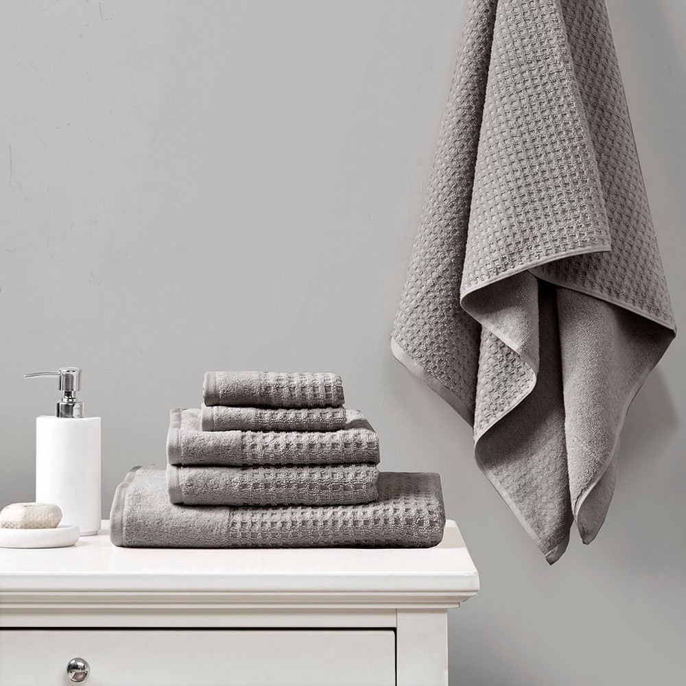 | Madison Park 6-Piece 2 Bath Towels: 28"W x 54"L (2) 2 Hand Towels: 16"W x 26"L (2) 2 Wash Towels: 12"W x 12"L (2) 100% cotton 2/20 combed Modern/Contemporary Style Includes 6 Piece(s) Wash before first use. Machine wash cold on gentle cycle with like colors. Only use non-chlorine bleach when needed. Avoid contact with products containing benzoyl peroxide. Do not wash with sharp items that may pull the towel fibers, such as zippers or hooks. To maintain the quality and performance of your towels, avoid the use of fabric softeners and dry sheets. Tumble dry low, remove promptly. Do not iron. Before use, simply shake towels to restore fluff and pile. Our Madison Park Spa Waffle Cotton Towel 6 Piece Set provides the perfect textured update to your bathroom decor. This 100% cotton towel set features an all-over waffle combed jacquard design for a rich texture, while the velour dobby cuff adds a stylish contrast touch for an updated look and feel. The 600gsm weight makes each towel soft yet also lightweight and quick-drying, so it does not get weighed down from moisture throughout the day. These towels are also finished with a SILVADURâ„¢ antimicrobial treatment providing built in freshness protection, inhibiting growth of odor causing bacteria, and keeping linen newer, longer. Active for multiple washes, this treatment delivers long-lasting durable odor protection performance. In addition, this towel set is also Made in Green by OEKO-TEX certified, meaning they do not include any harmful substances or chemicals while also using sustainable processes and socially responsible working conditions, for the best in quality comfort and wellness. Complete the look with coordinating Spa Rug and Spa Waffle Shower Curtains, available and sold separately. Set includes: 2 standard 28x54" bath towels, 2 standard 16x26" hand towels, and 2 standard 12x12" wash towels. |