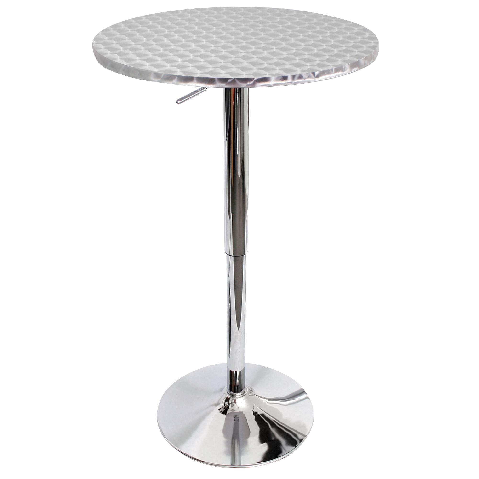 | Stainless steel top features decorative hypnotic sparkle pattern. Hydraulic lever adjusts table from 26 to 41 inches in height. Perfect for smaller kitchens or dining areas. Polished chrome base, Silver swirl top. |