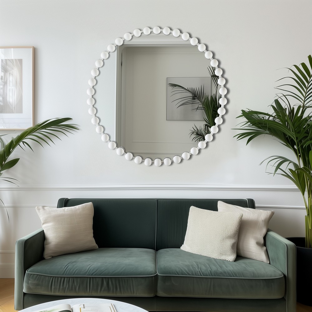| Madison Park Signature 36" Dia Overall: 36"Dia x 1.8"D Mirror: 33.8"Dia Iron: 45% Mirror: 45% MDF: 10% Modern/Contemporary Style Includes 1 Piece(s) Spot clean only Elevate your home decor with the Madison Park Signature Marlowe Round White Wall Mirror. This large 36" decorative mirror combines a vintage-inspired beaded frame with a sleek, modern matte white finish, adding luxury and charm to any room. Crafted with high-definition glass, this generously sized round wall mirror ensures a clear, distortion-free reflection and comes ready to hang with pre-installed hangers, making it an ideal wall decor statement piece for your vanity, living room, bedroom, or entryway. Shop now and bring a touch of modern elegance to your home. |