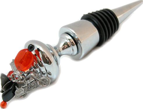 | The motorcycle theme bottle stopper is embellished with a motorcycle charm, a hog charm, an eagle charm and orange and black glass beads. This chrome-plated stopper has multiple suction rings that create a great seal. |