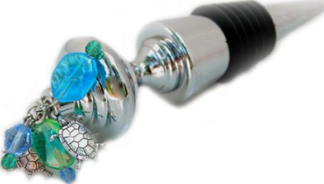 | The Sea Turtle wine bottle stopper is embellished with 3 silver sea turtle charms, and turquoise, lime green, blue and green glass beads. The chrome-plated stopper has multiple suction rings which create a secure seal. The Sea Turtle wine bottle stopper comes in a white box. |