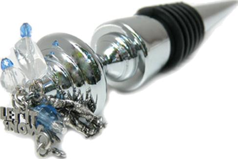 The snow ski theme bottle stopper is embellished with a skier charm, a snowflake charm, a "Let it Snow" charm and blue and clear glass beads. This chrome-plated stopper has multiple suction rings that create a great seal.