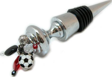 The soccer bottle stopper is embellished with 3 enameled black and white soccer ball charms, and red, black and white glass beads. This chrome-plated stopper has multiple suction rings that create a great seal.