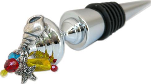 | Wine Bottle Stopper embellished with pewter starfish charms and colorful glass beads. Chrome plated with multiple suction rings this bottle stopper is cone shaped to fit almost any size bottle. What a fun memory of times spent at the beach! |