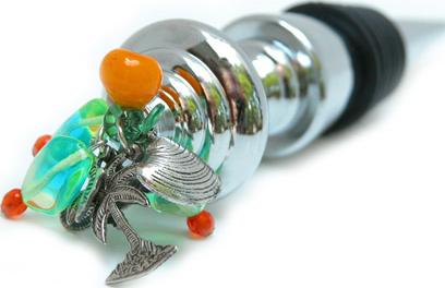 | The Florida theme bottle stopper is embellished a gator charm, a palm tree charm, a seashell charm, the state of Florida charm, a glass Florida orange, and colorful glass beads. This chrome-plated stopper has multiple suction rings that provide a secure seal. |
