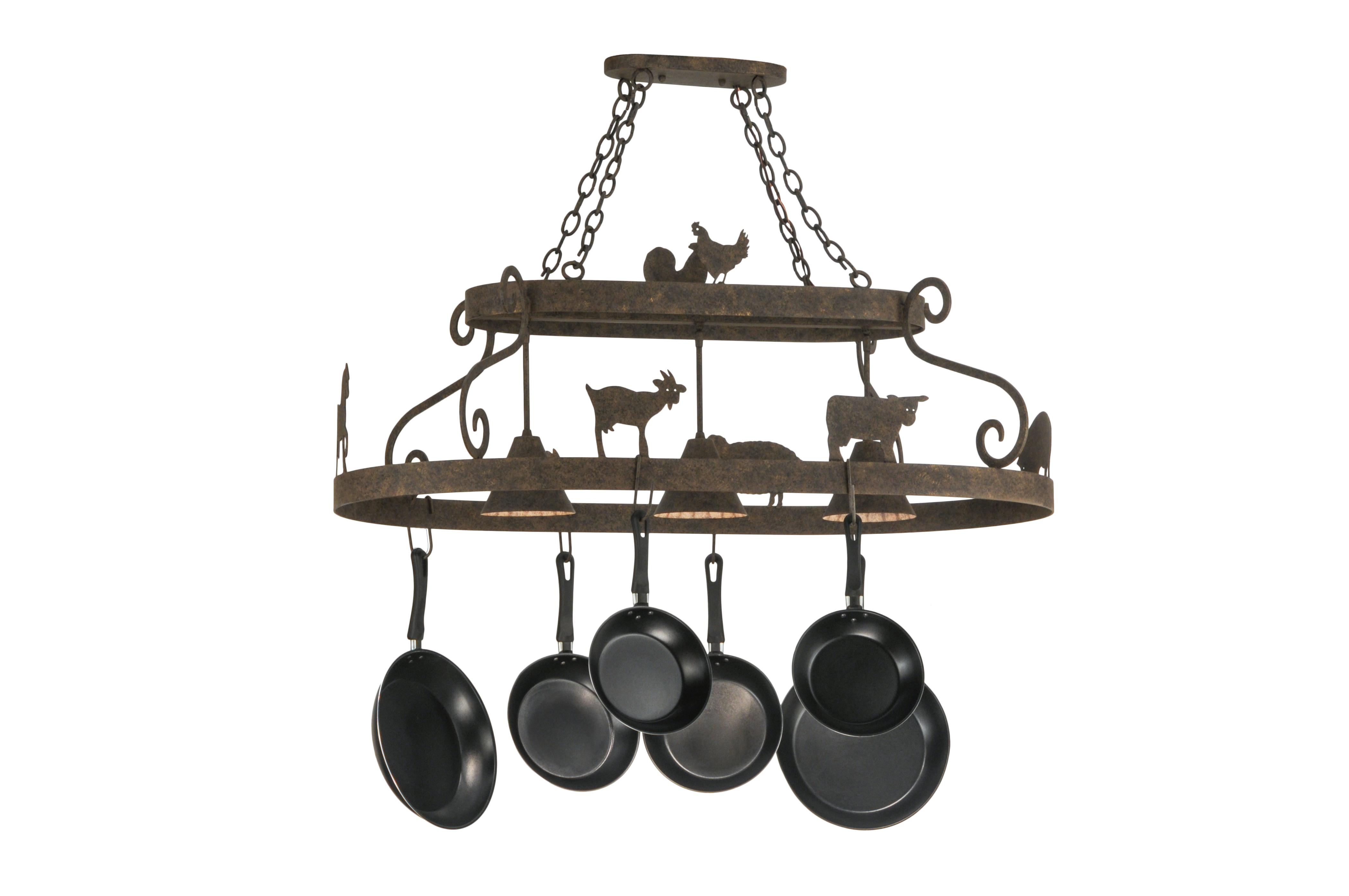| Country Barn Animals including a Cow, Goat and Rooster silhouettes are depicted on rings of this Pot Rack fixture designed with three downlights in center. Hooks are included to hang pots on this fixture handcrafted in the USA by Meyda artisans. Custom sizes, styles and colors available. Meyda Tiffany Pot Rack |