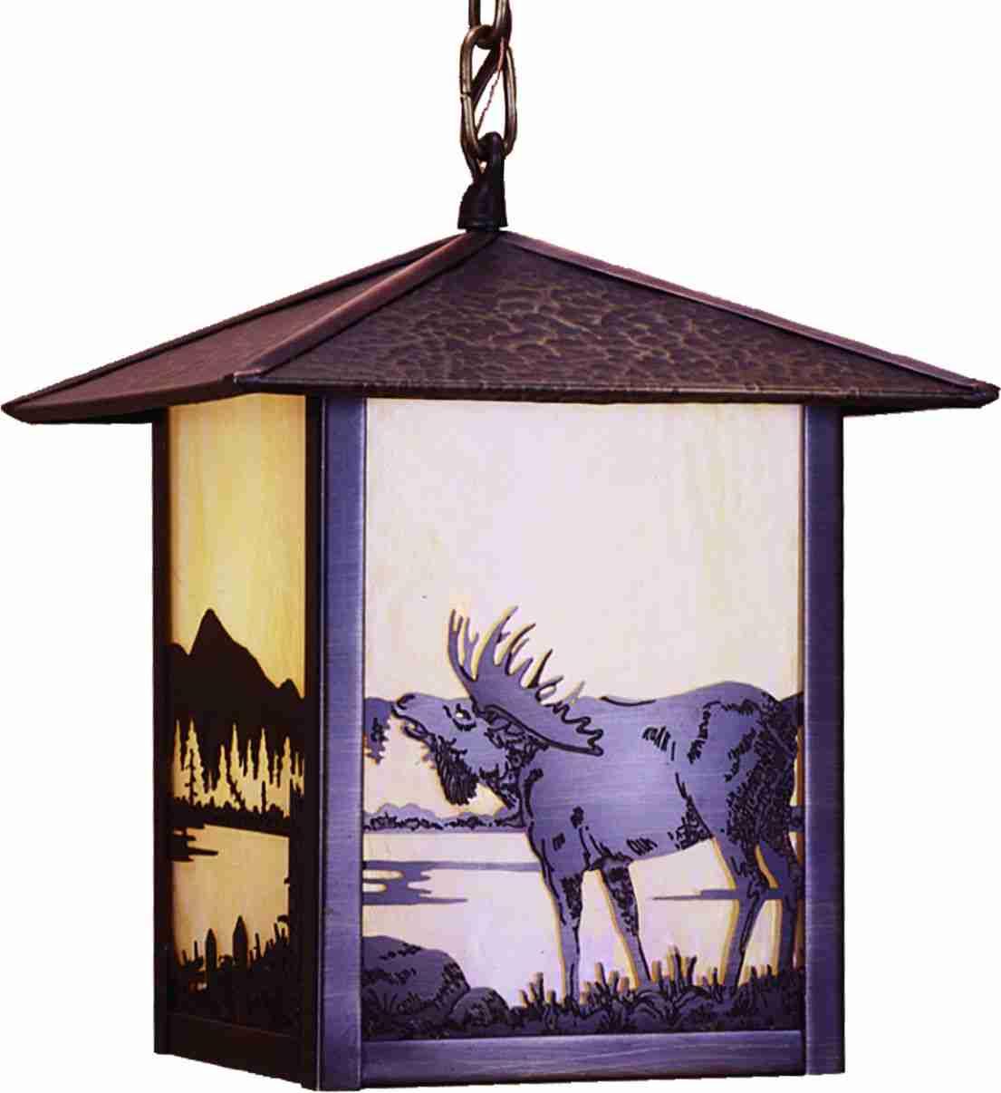 The majestic North Woods Moose is depicted on this handsome American Craftsman lantern style ceiling pendant. The fixture, handcrafted in the USA by Meyda artisans, is finished in Craftsman Brown and has Iridized Beige glass panels.