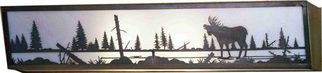 The majestic North Woods Moose is depicted on this handsome American Craftsman style vanity light. The fixture, handcrafted in the USA by Meyda artisans, is finished in Craftsman Brown and has Iridized Beige art glass panels.