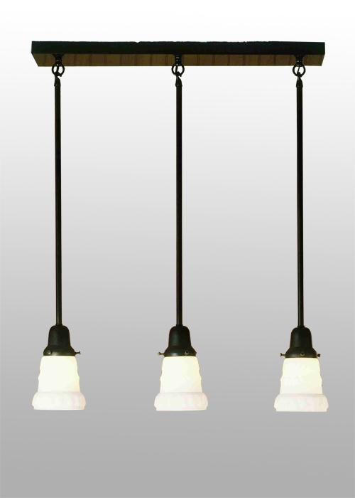 | Bulb: 3 regular 60 Watt Total Height: 30" Total Length: 24.5" Total Depth: 5" Round Rods Embossed Cased Glass Custom Crafted In Yorkville, New York Please Allow 30 Days |