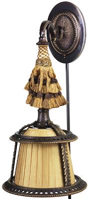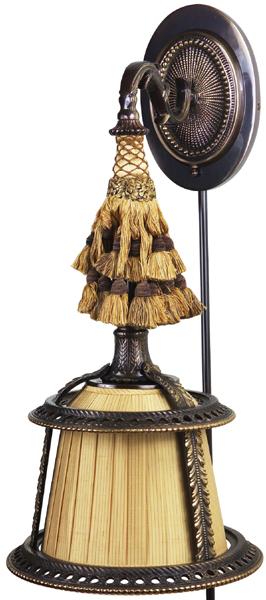| Hand colored bronze over brass tasseled sconce Soft pleated shantung shade 40W Candelabra Base Line Switch |