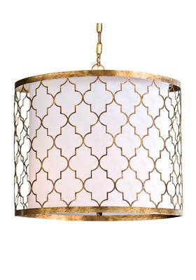 A minaret like fretwork frame in brushed nickel or antique brass metal floats and surrounds a white linen inner shade.