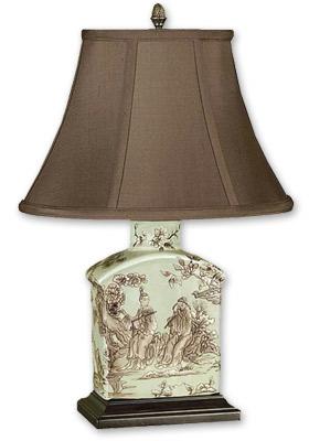 | Chinese charm: Porcelain lamp decorated with a classic scheme of hand-painted, ancient motifs on a wood base. Bell shaped brown silk shade and antique brass finial. On/Off Switch 1-60 Watt Bulb |