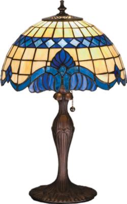 | Regal Scrolls Of Royal Blue With Coordinating Diamonds, Adorn This Handsome Tiffany Style, Stained Glass Shade. The Dome Shade Is Paired With A Coordinating Accent Lamp Base, Hand Finished In Mahogany Bronze. Height: 18.5 |