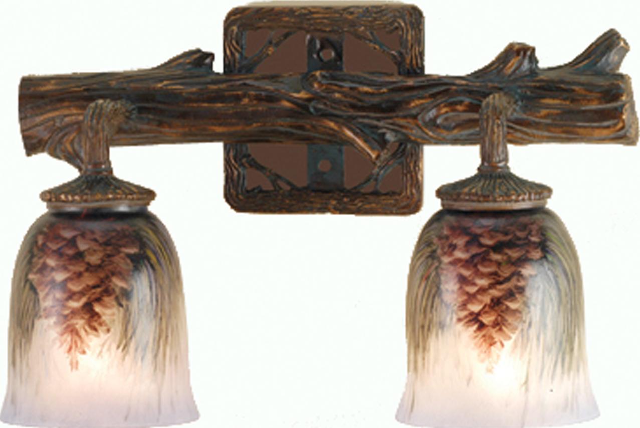 | Inspired By Nature, Hand Painted Pinecones And Branches Of Tan And Bark Brown With Pine Green Needles Against A Sky Blue Ground, Grace These Distinctive Glass Shades. Two Shades Are Suspended From A Pine Branch Detailed Two Light Sconce In A Golden Pine Finish. Meyda Tiffany WALL SCONCE |