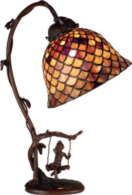 | A Louis Comfort Tiffany Studio Classic Fishscale Pattern Reproduced In Variegated Tortoiseshell Of Ambers And Burgundy. This Handsome Stained Glass Shade Is Used With A Mahogany Bronze Hand Finished Lamp Base Featuring An Adorable Cherub On A Swing. A Versatile Accent Lamp To Complement Any Color Or Style. Meyda Tiffany LAMPS |