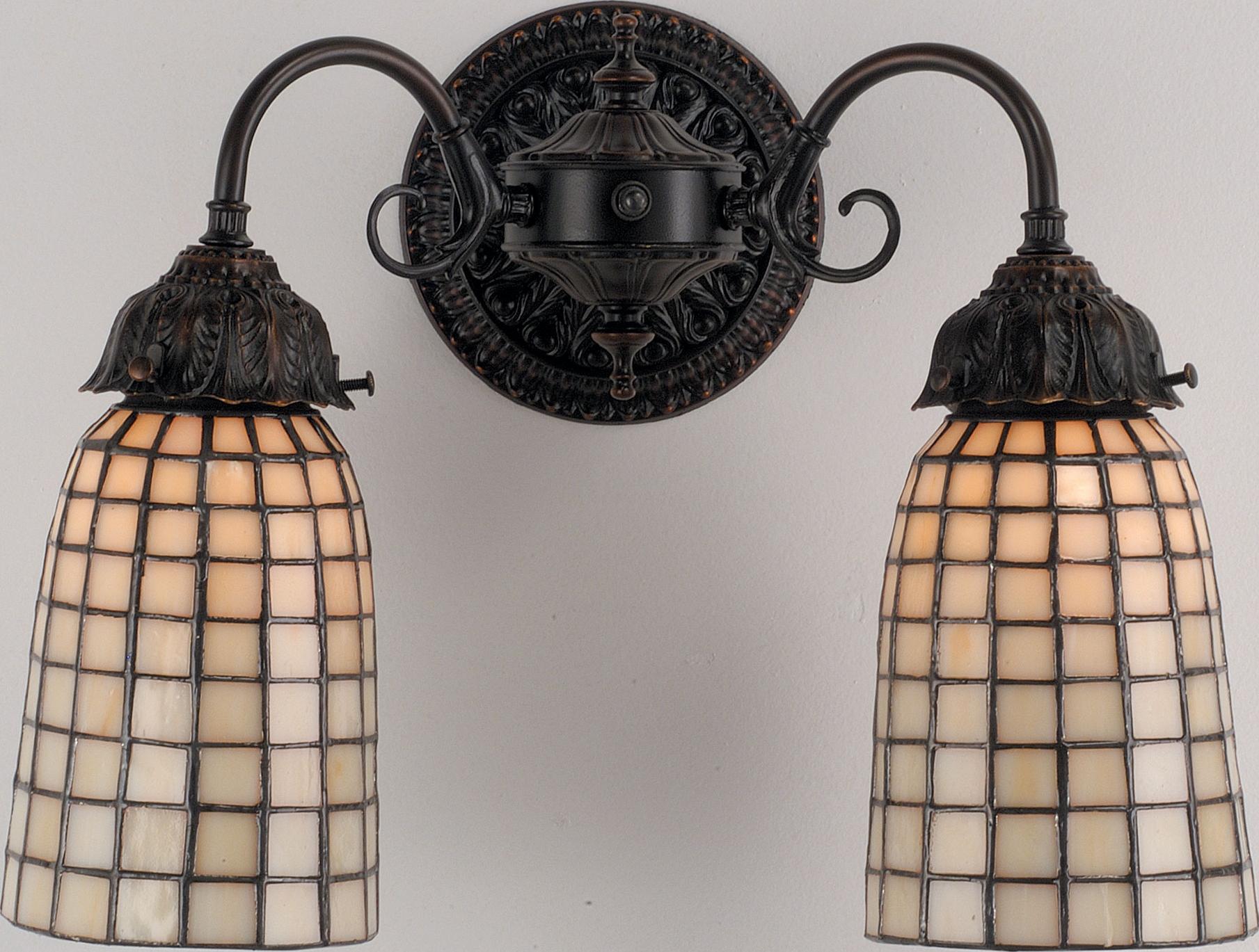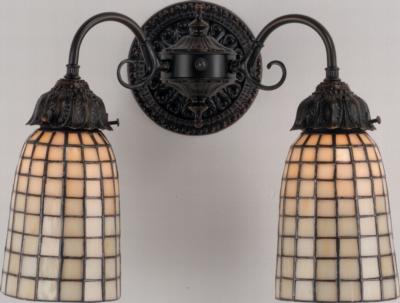 | Elongated Hand Crafted Tiffany Shades Of Bone-Beige Glass In A Geometric Grid Pattern Are Suspended From Gracefully Curved Arms In This Classic 2 Light Wall Sconce. Meyda Tiffany WALL SCONCE |