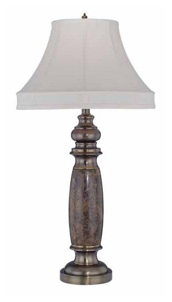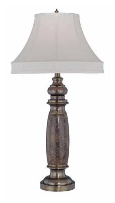 Exquistely styled solid marble body, fiteed with an elegant antique brass base and collar. Topped with a tailored off-white silk soft back shade and matching solid brass finial.